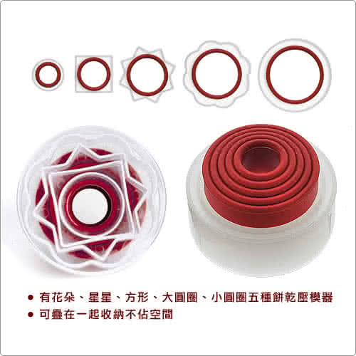 可以親手做餅乾是件幸福不過的事了。夢幻餅乾壓模器有花朵、星星、方形、大圓圈、小圓圈五種壓模器,讓您輕鬆做出各種不同造型的餅乾。壓模器的握把包覆軟性矽膠,提供最佳的手感體驗。收納時,這五個壓模器更可疊在一起,輕鬆收納不佔空間,是您烘焙餅乾不可或缺的好幫手。