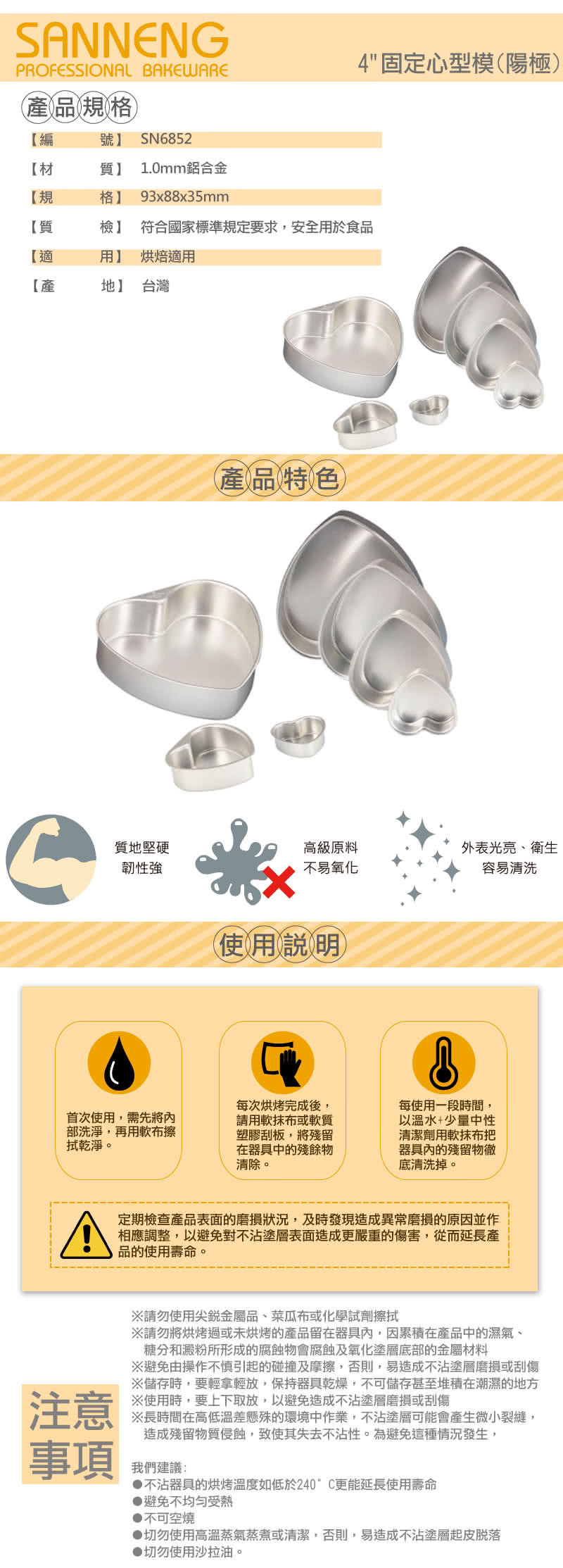 【SANNENG 三能】4吋固定心型模 陽極(蛋糕模)耐用嗎衛生安全嗎Ptt及mobile01推薦的人多嗎